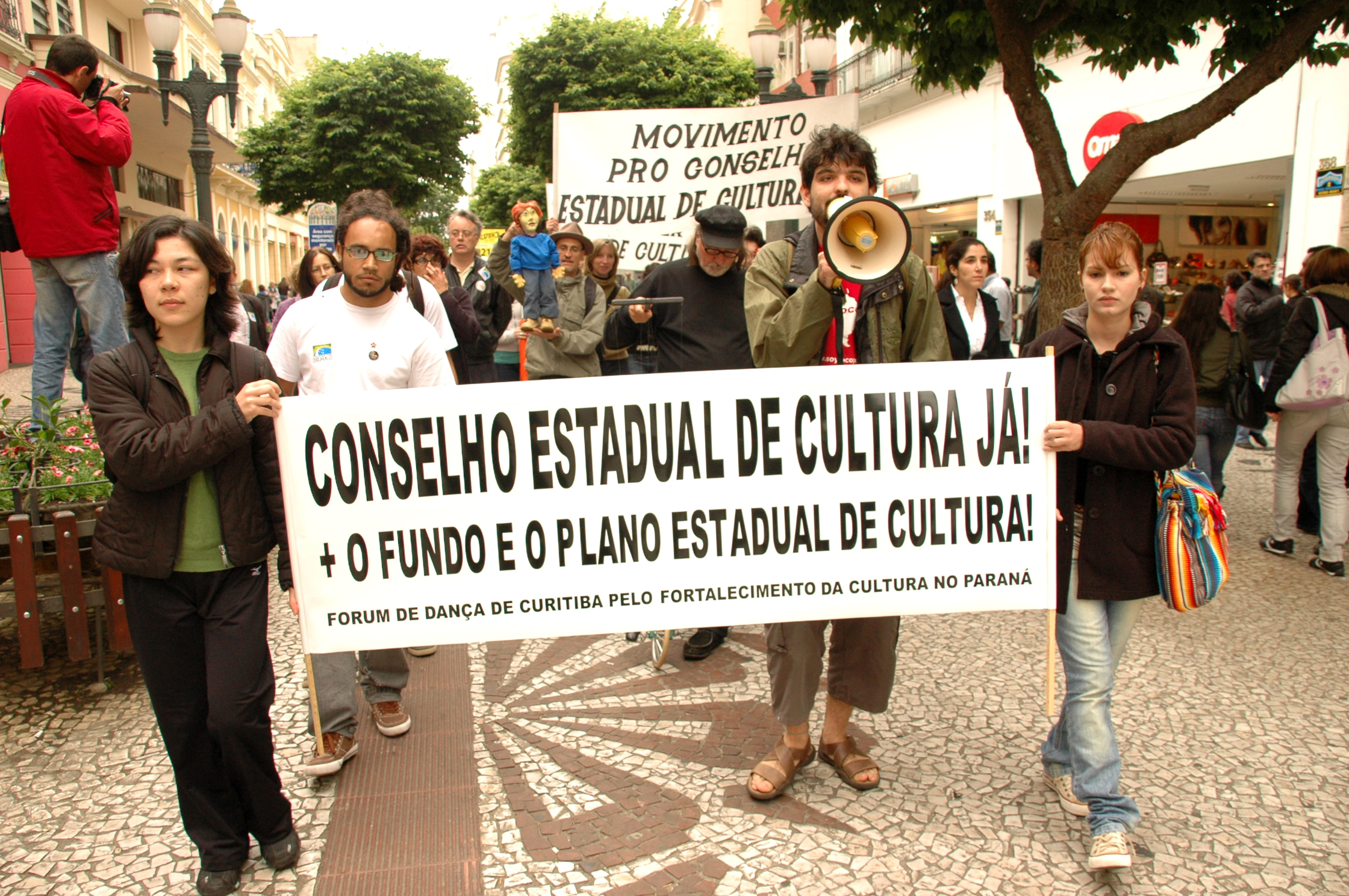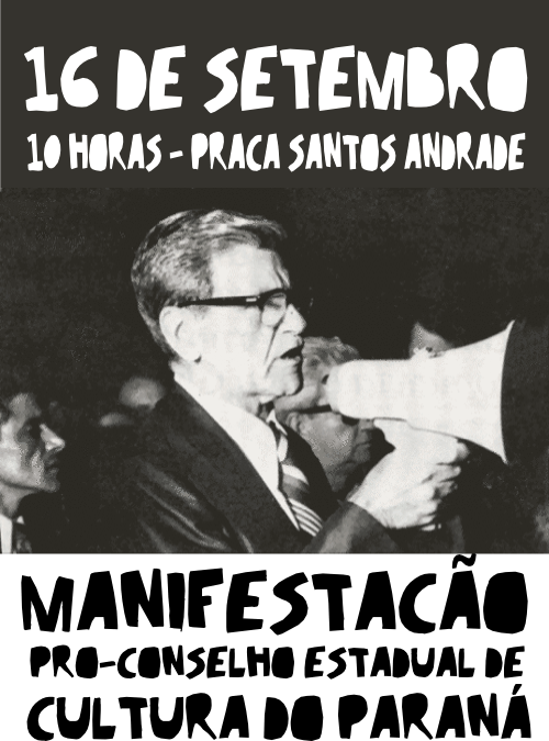 Artistas e fazedores de cultura foram à rua nesta manhã para reivindicar a constituição de um conselho estadual de cultura. A manifestação saiu da Praça Santos Andrade em caminhada até a Secretaria Estadual de Cultura para protocolar o pedido a secretária Vera Mussi e mostrar a insatisfação pela falta de políticas públicas culturais destinadas a outras esferas que não o Museu do Olho e o Teatro Guaíra!