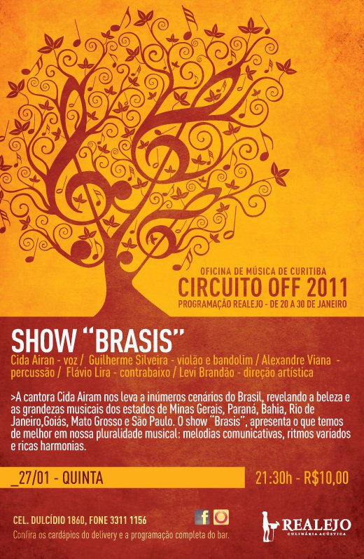 E abrindo com chave de ouro, a cantora Natalense Cida Airam nos apresenta o show “Brasis” no Realejo bar. No dia 27/01, circuito OFF da Oficina de Música de Curitiba, todos poderão conferir esse show belíssimo.