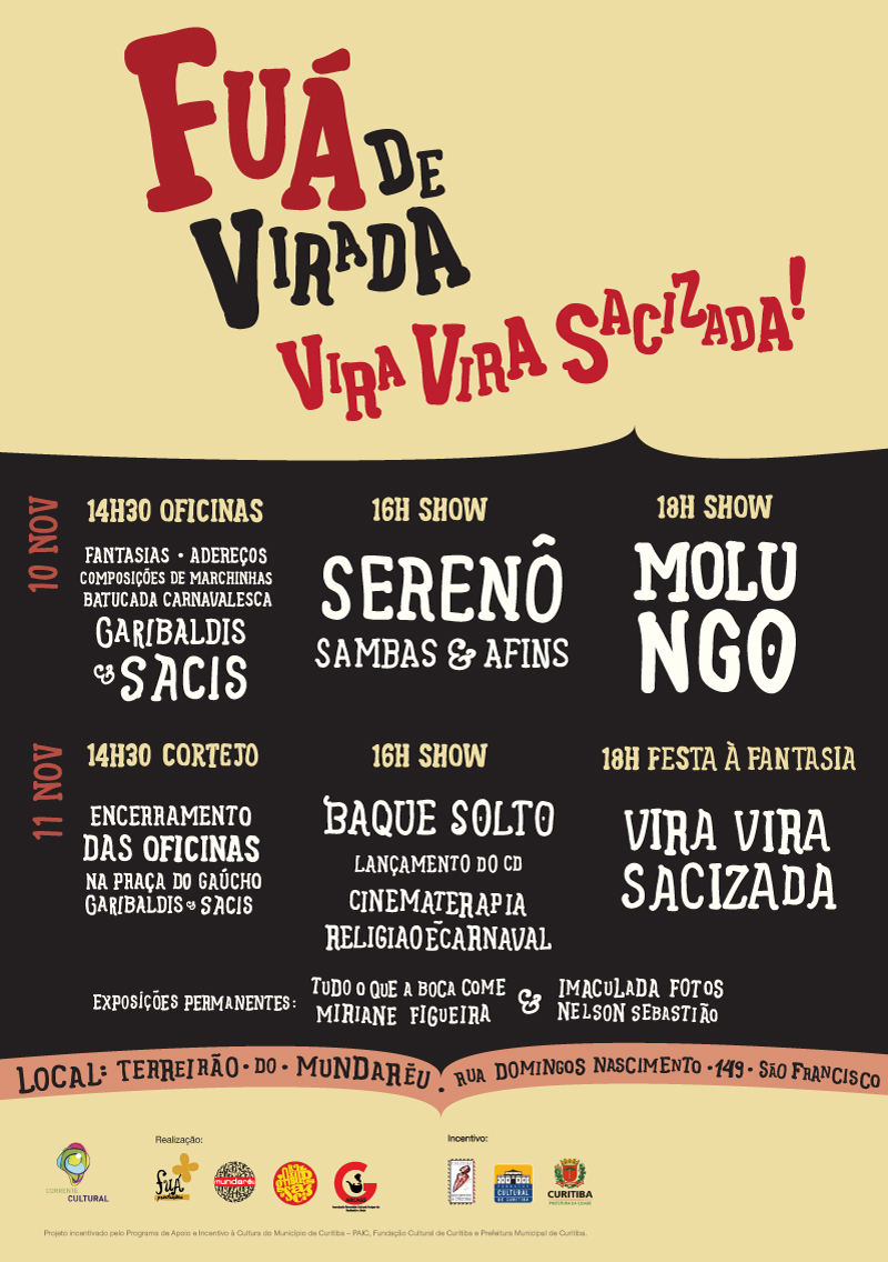 Em seguida vem a Virada Cultural, e dessa vez estamos no circuito central com o projeto “Fuá de Virada”, junto com o “Vira Vira Sacizada”do Garibaldis e Sacis. Também iremos apresentar o projeto “Cortejando Mundaréu”, musical de rua que comemora os 15 anos do grupo Mundaréu, com muitas participações especiais.