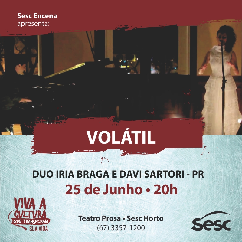 piano do duo Iria Braga (PR) e Davi Sartori (PR) no Sesc MS. Campo Grande (MS) recebe pela primeira vez o show Volátil, duo de voz e piano criado pelos paranaenses Iria Braga e Davi Sartori, com composições de artistas locais e autorais do duo. “Volátil” tem como pilar artístico a fusão dos universos particulares de dois instrumentos – a Voz e o Piano. Ou poderíamos dizer, a fusão dos universos particulares de dois artistas que se propõem investigar performance e interpretação, relações e possibilidades expressivas dos seus instrumentos.