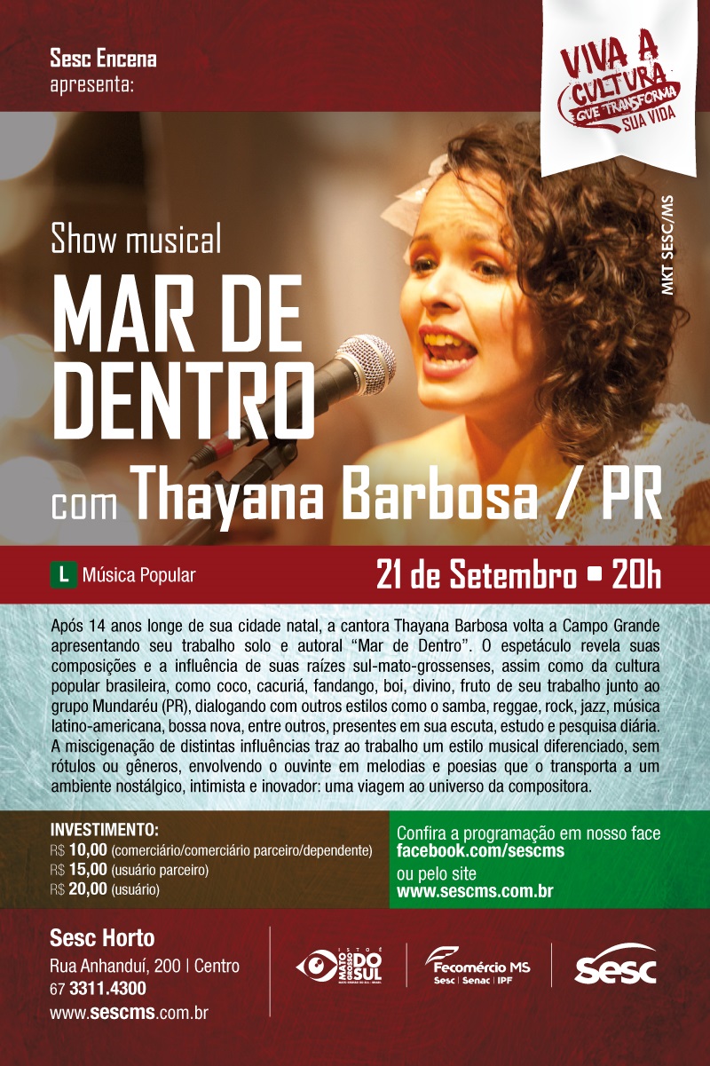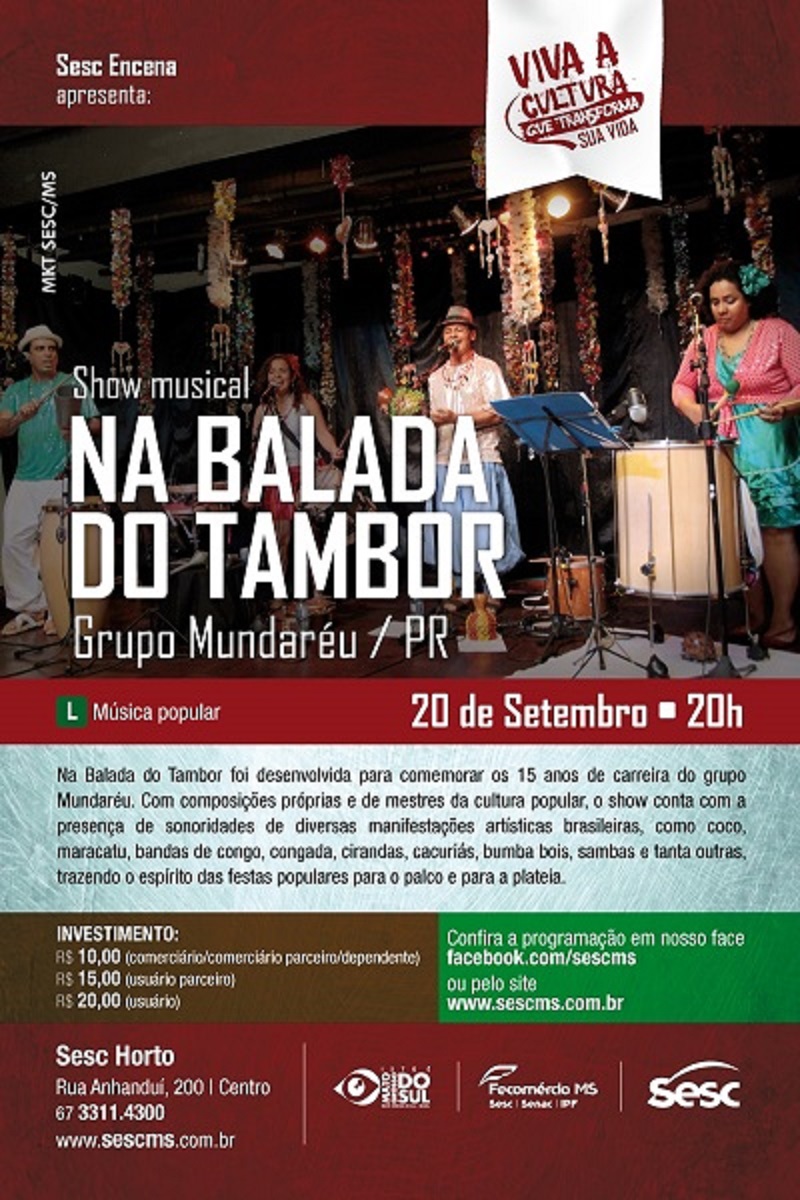No mês de setembro o grupo Mundaréu e Thayana Barbosa estarão no Sesc Horto em Campo Grande MS para o projeto Sesc Encena. O grupo Mundaréu apresenta o seu “Na Balada do tambor” show que comemora os 15 anos de carreira do grupo, com composições próprias e de mestres da cultura popular que levam ao público o espírito das festas populares. A cantora e musicista Thayana Barbosa retorna à sua cidade natal para apresentar o seu trabalho solo e autoral “Mar de dentro”. O espetáculo traz suas composições e mostra um pouco de suas influências sul-mato-grossenses. Vai ser uma festa só!!