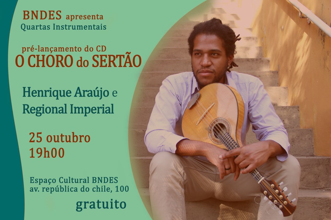No dia 25 de outubro, estaremos no Rio de Janeiro com o espetáculo “O choro do Sertão” pré-lançando o CD homônimo do bandolinista Henrique Araújo (SP) acompanhado pelo talentosíssimo Regional Imperial. O show será apresentado no projeto Quartas Instrumentais no Teatro do BNDES. Após anos de pesquisa debruçada na obra do grande Dominguinhos. Apresentando um repertório com composições de choros do Mestre, o show é uma homenagem ao grande compositor da musica brasileira e revela uma face pouco conhecida de Dominguinhos apresentado em um formato tradicional de choro.