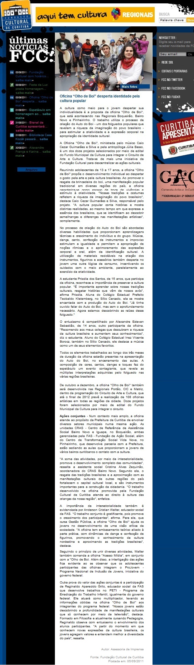 Oficina Olho de Boi é destaque de notícia no site da Fundação Cultural de Curitiba http://www.fundacaoculturaldecuritiba.com.br/noticias/oficina-_olho-de-boi_-desperta-identidade-pela-cultura-popular