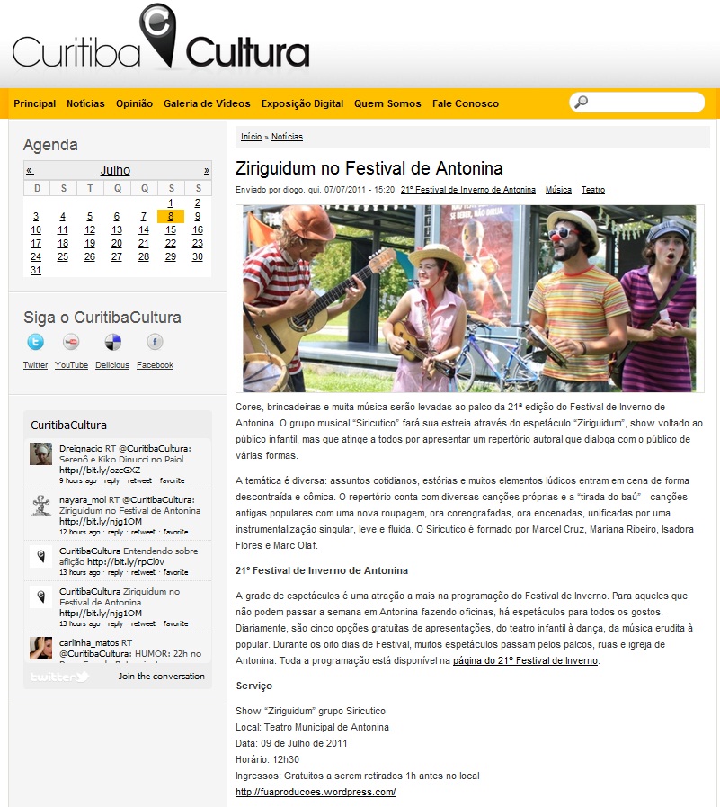Espetáculo Ziriguidum no Festival de Inverno de Antonina. Matéria “Curitiba Cultura” http://www.curitibacultura.com.br/noticias/ziriguidum-no-festival-de-antonina